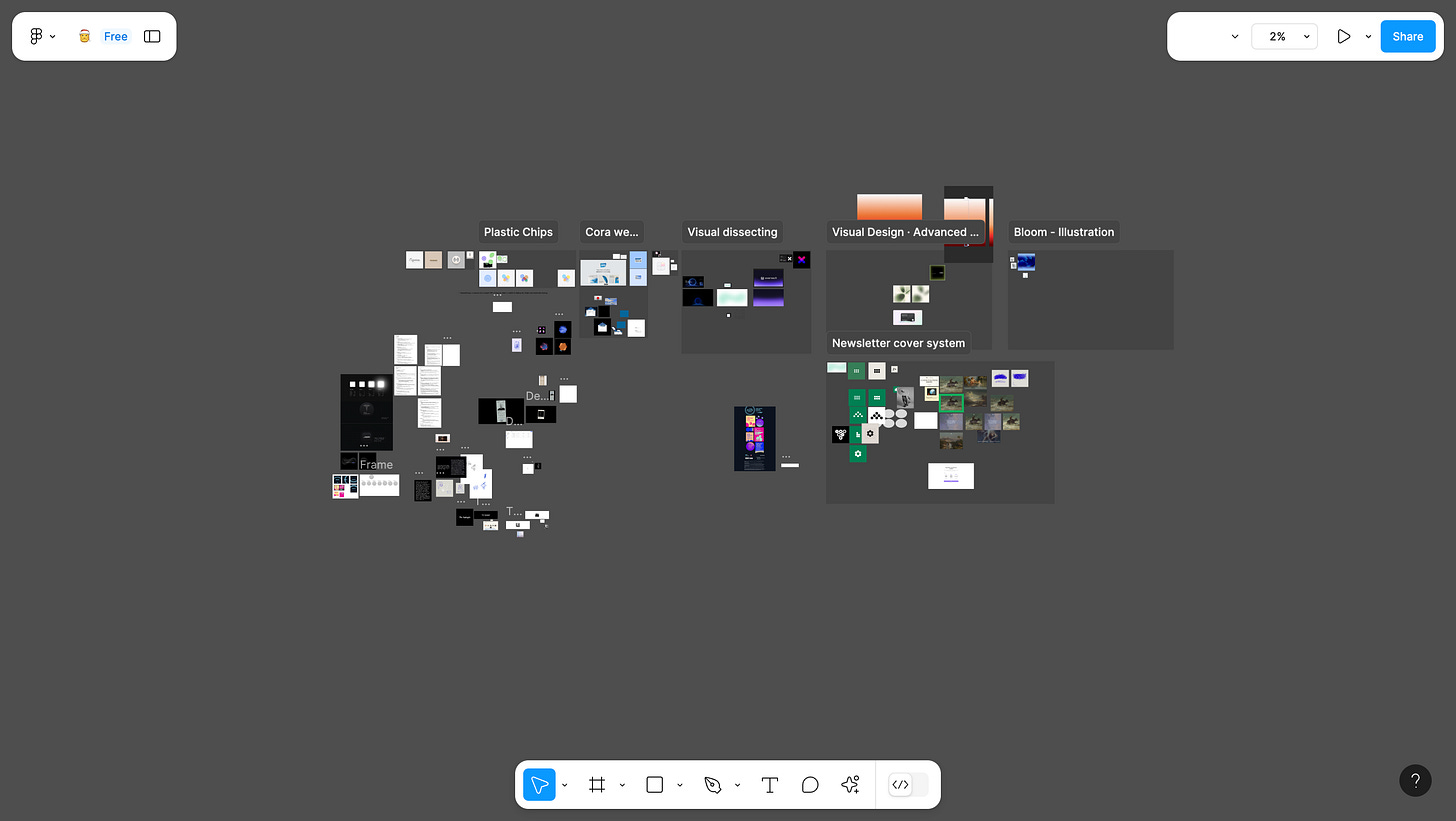 For example, I open a fresh (and messy) Figma file. Then, I explore any idea that comes to mind relentlessly, without worrying about limits or rules. Everything is fair game.